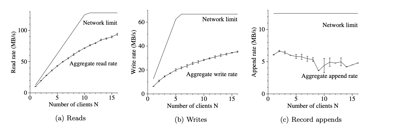 한 복제본에서 다른 복제본으로 데이터를 전파하는 데 지연이 발생하면 전체 쓰기 속도가 저하된다.. 클라이언트 수가 증가함에 따라 여러 클라이언트가 동일한 청크 서버에 동시에 쓸 가능성이 높아진다. 또한 각 쓰기에는 세 개의 서로 다른 복제본이 포함되므로 16명의 읽기보다 16명의 쓰기에서 충돌이 발생할 가능성이 더 높다.