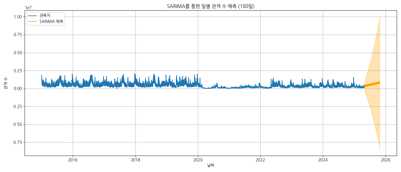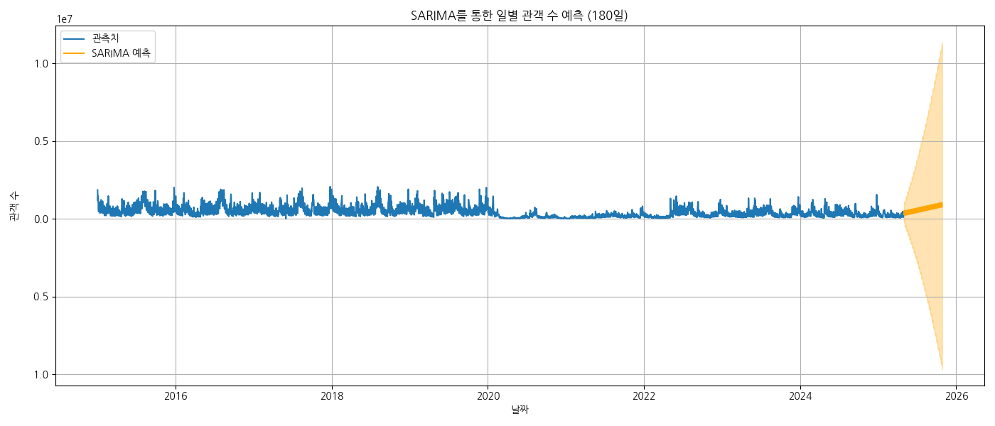 plt.title("SARIMA를 통한 일별 관객 수 예측 (180일)")