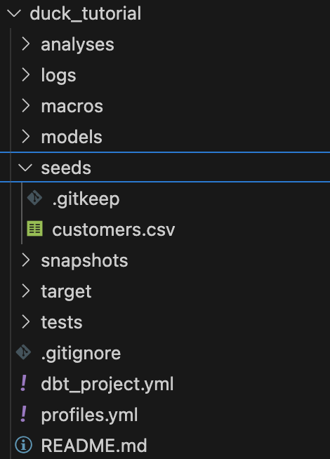 dbt seed 명령어로 csv의 데이터가 duckdb에 테이블로 적재됩니다. (dbt.duckdb 파일이 생성됩니다.)