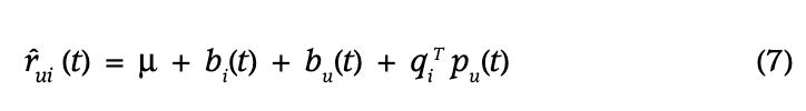 시간에 따라 변하는 매개변수들을 정확하게 수식화하면, 식 (4)는 시간 에서의 평점을 예측하는 동적 규칙으로 대체됩니다.